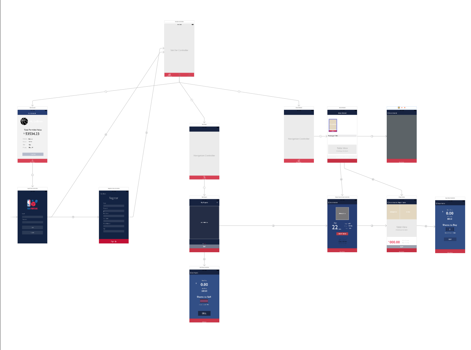 I was in charge of creating the UI and creating design guidelines for how the visuals of the app. I also created wireframes to map out the flow of the app and how every tab should transition to the next. I was also involved on the coding front by coding the Buy and Sell functionality as well as the Detailed Player View, which showed the player’s seasonal stats and performance on the latest 5 games.