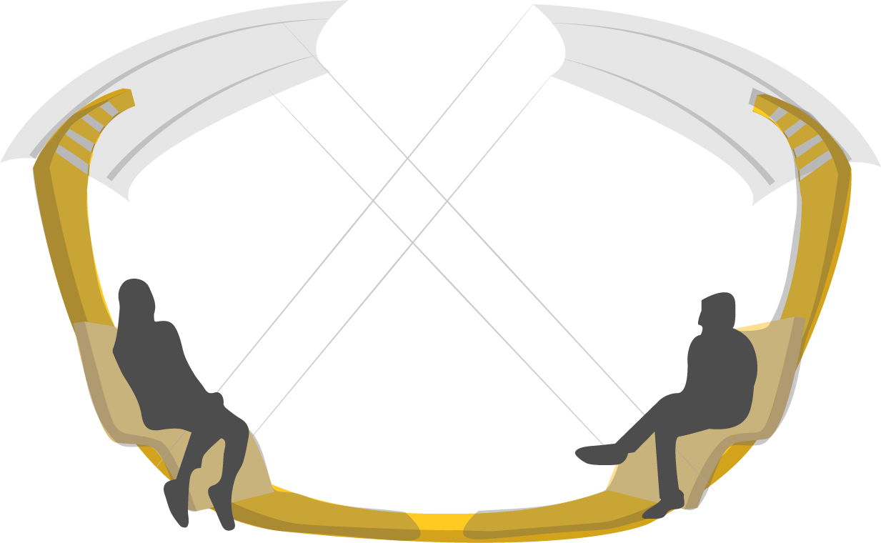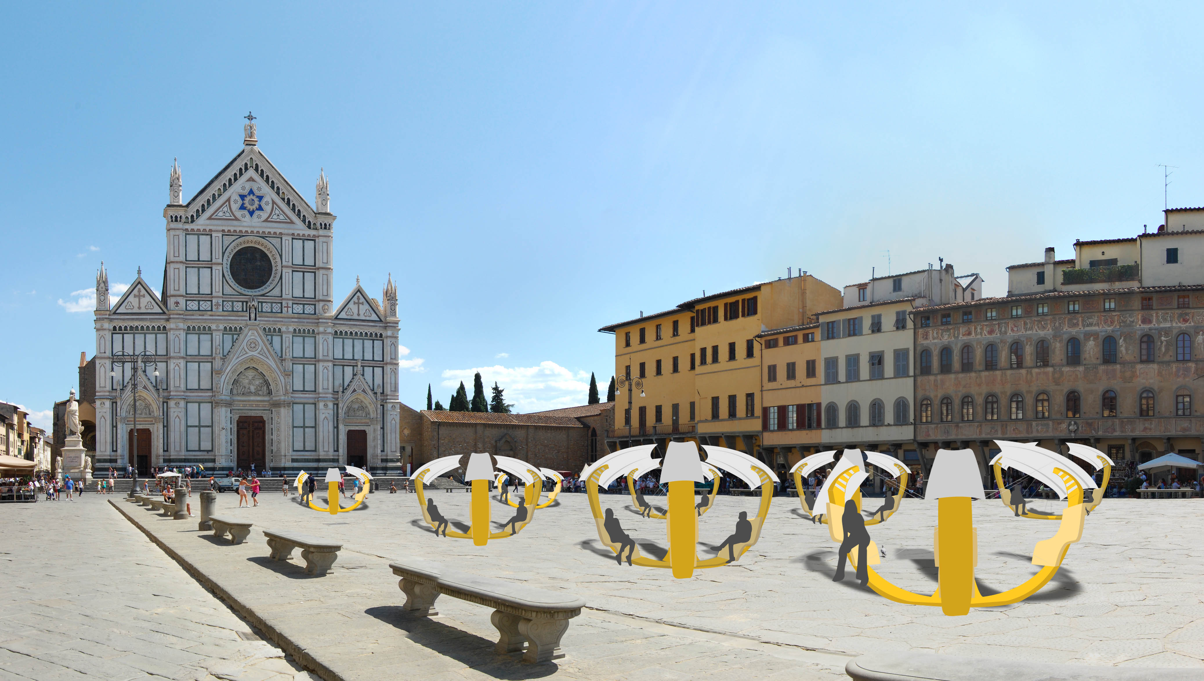 Designed in an elongated U-shape, these chairs would be dispersed throughout a plaza, creating pockets of space which break up the established movement patterns in a square.